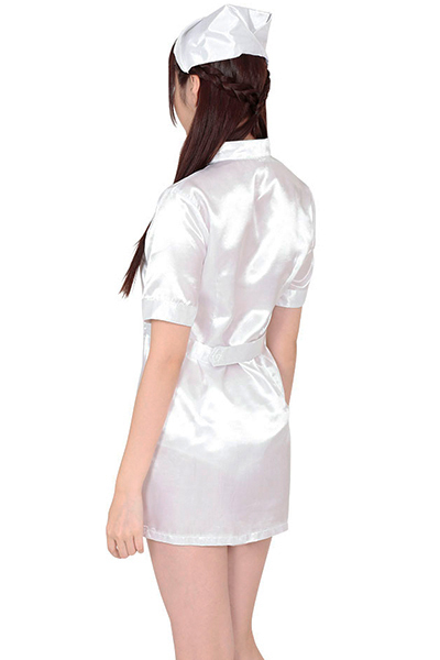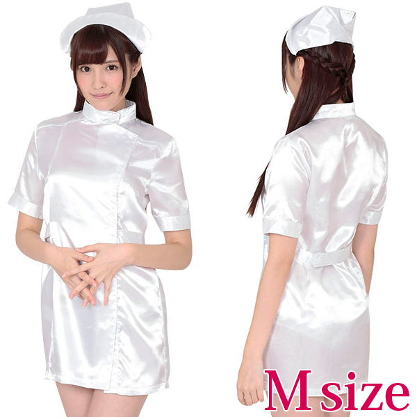 男女問わず、誰もが一度は憧れるナースのコスプレ衣装!キラキラとした純白生地の光沢感がとってもキレイで、セクシーなミニスカートタイプです。フロントはボタン式で下まで開きます。※Lサイズ(b18109)、LLサイズ(b18128)あります。