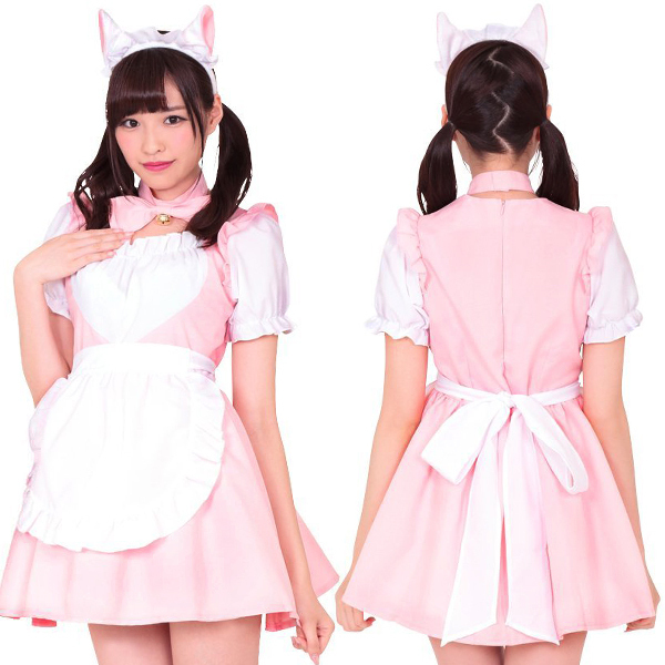 ネコ耳と鈴付きの大きなリボンが可愛い!メイド コスチューム「いちご☆メイド ピンク」。裾や縁取りにはレースフリルを使用しているので、ふんわりボリュームたっぷり!ワンピース・エプロン・チョーカー・カチューシャの4点セットです。