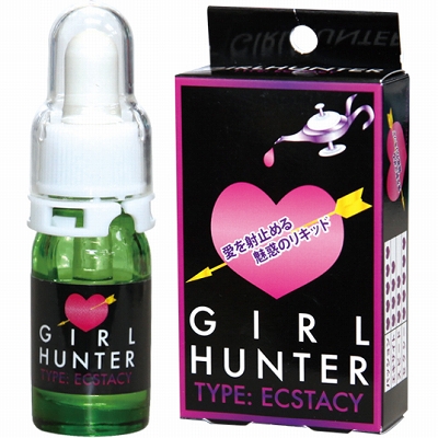 お飲み物と一緒に飲むタイプの女性用リキッド「ガールハンター (エクスタシー)」。パッケージサイズは11.5×6.0×2.5cm、内容量は5mlとなっています。