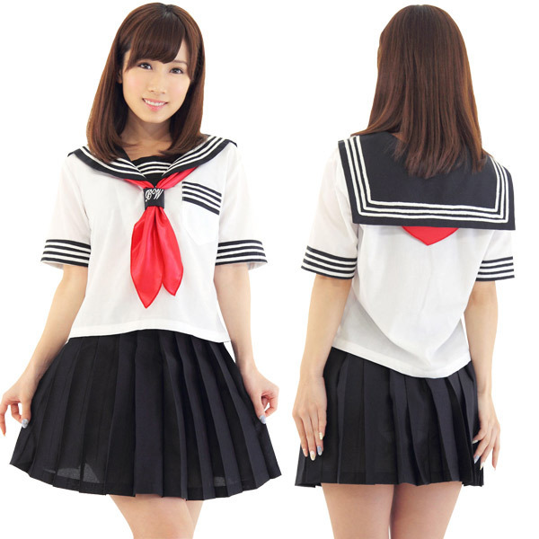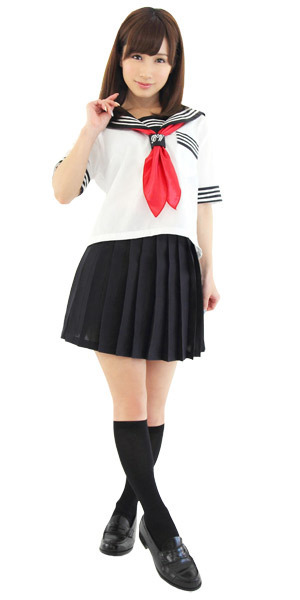 赤いスカーフがポイント!人気の定番セーラー服コスプレ。涼しげな夏服仕様の半袖タイプ!襟元や袖のオーソドックスな3本ラインが超リアル!ミニ丈のプリーツスカートがセクシーなスクール系コスチュームです。※Lサイズ(b17496)、LLサイズ(b17522)あります。