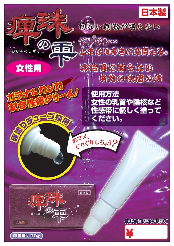 成分にガラナ&カンカを配合した「痺珠の雫(ひじゅのしずく)」。日本製のクリームで内容量は10g。直塗りチューブを採用しているので扱いやすく塗りやすい!冷温感に頼らない女性用のクリーム。女性の乳首やクリトリスなどに塗って楽しめるラブアイテムです。チューブには商品名などの記載がありませんのでバッグやポケットに入れておくなど、場所を選ばずいつでもどこでもご使用頂けます!