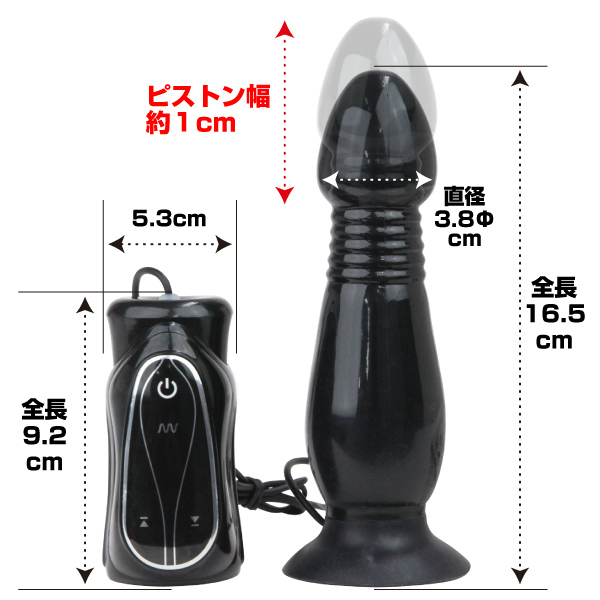 強力吸盤で固定力抜群!ソフトブラック樹脂製、ピストン機能付き電動アナルプラグ。亀頭のようなカリ下をジャバラに設計して、上下の振れ幅が約1cmの激しいピストン運動を実現!有線リモコンにすることで、手元で3段変速+バイブパターン7種類を操作できる、多機能アナルプラグが完成しました。突き上げ&振動、Wの刺激で猛烈エイナス責め!擦れる快感がたまらないアナルグッズです。単三電池4本とローション30ml付属。※製造時期によりパッケージのデザインが異なる場合がございますが中身は同じです。