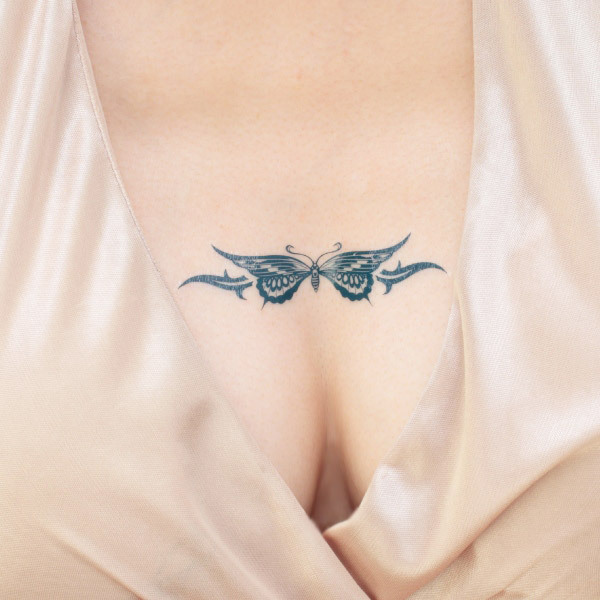 ブルーと黒の蝶が美しいタトゥーシール「腕輪・トライバル蝶」。水を使って簡単に貼り付けられる便利さ!コレを貼るだけで雰囲気がガラリと変わり、手軽にちょっとヤンチャなファッションが楽しめちゃいます。男性でも女性でもエロかっこよく決まる!私服はもちろんコスチュームにも合わせれば、オシャレの幅が広がりますよ。