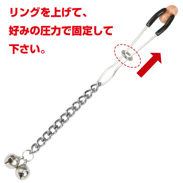 体で、目で、耳で感じる大人の遊び!クリトリスに装着して快感を楽しむボディクリップ。先端にラバーコーティングを施して、ズレることなくクリトリスを挟み込める&敏感部分を痛めないソフト設計。リングで圧加減を調節すれば装着完了!快感に身をよじらすたびに、チェーンで繋がれた鈴がチリンチリンと軽やかに音色を奏でるボディクリップです。