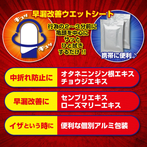 早漏改善ウェットシート「持久王 2枚入りウェットシート」。オタネニンジン根エキス、チョウジエキス、センブリエキス、ローズマリーエキス配合。