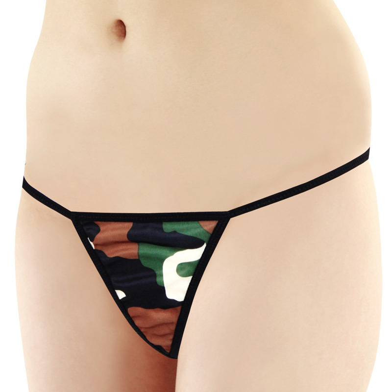 <EROX>コスチュームのお供にも♪アウターに響きづらいTバックショーツ。●迷彩柄×ブラックのアーミーカラー●ミニマムな三角形フロント●繊細ストリングなサイドデザイン●セクシー度高めな大胆Tバック。タイトなアウターにも響きづらいので普段使いもバッチリ!ブラック・ブラウン・グリーンと多彩なカラーを使用しているので、あわせるブラジャーも選びやすいのが嬉しいですね。