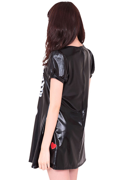 肋骨・背骨・骨盤が丸見え?!スケルトン風のイラストがキモ可愛いホラー系コスチューム。●ツヤ感があるブラックカラー●ちょっぴりハードロックなAラインワンピース●スカートの部分にハート・クロスボーンズ・ゴシック調の十字架をプラス。ハロウィンパーティやホラーナイトなどのイベントで注目の的に…!お化けの姿を手軽に楽しめるコスチュームです。※ストッキングは付属しません。