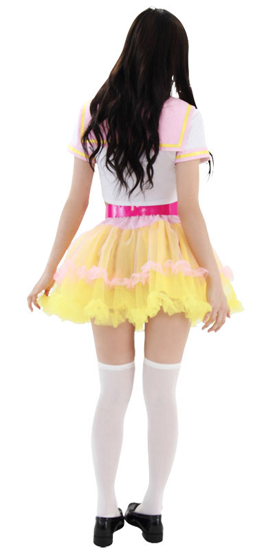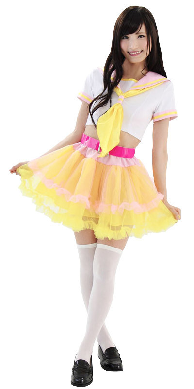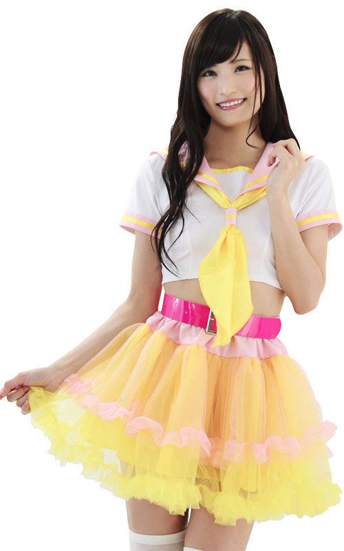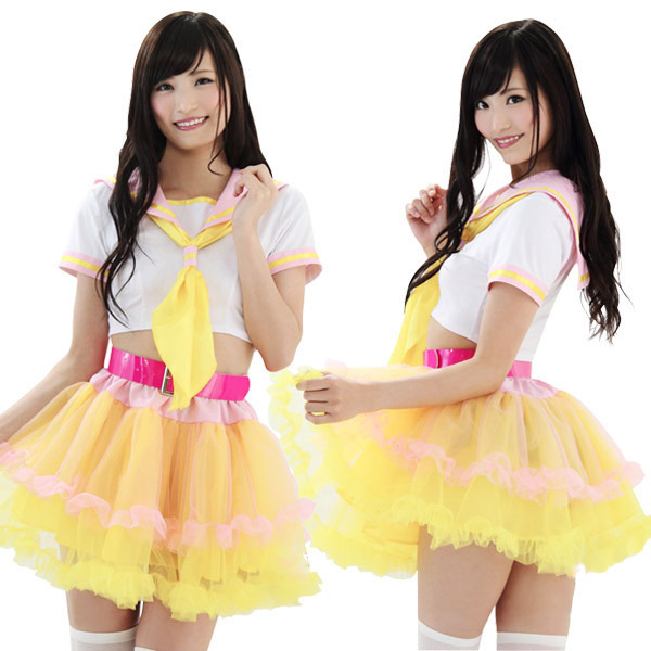 愛されアイドルになりきっちゃおう♪ふわふわ可愛いセーラー風衣装。●ピンク&イエローのパステルカラー●差し色の鮮やかピンクな太ベルト●トップスはおヘソが見える短め丈●ふんわり広がるパニエスカート●統一感のあるアイドル風セット。みんなの注目を一身に浴びるアイドルに大変身!ふわふわキュートなパステルカラーにパキッとビビッドなピンクが映えるアイドル風のセーラー服です。※こちらの商品は受注発注商品の為、ご注文から発送まで2〜3営業日掛かる場合が御座います。