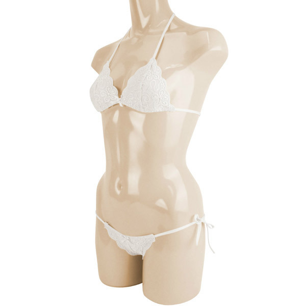 可憐な花柄刺繍を施したオールレースのセクシーブラ&ショーツセット。●ホワイトカラーの総レース仕上げ●可愛いスカラップレースデザイン●着心地の良いストレッチ素材●ホルタータイプのブラレット●サイドで結ぶTバックショーツ●上下共に紐でサイズ調整可能。美しくも可愛らしいフラワー刺繍のランジェリーセット!うっすらと肌を透かす総レースでセクシーさもしっかりアピール出来ちゃいます。