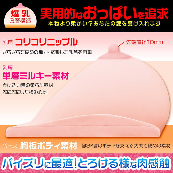 リアルさを追求した夢のようなIカップおっぱい「Iカップパイズリ爆乳」が登場!見た目から触り心地まで魅力溢れる乳房です。爆乳好き必見の収まりきらないIカップ爆乳は、釣鐘型のフォルムでよりエロさを引き立てています♪乳首もリアルさを追求し、コリコリとした素材で再現!シリコンおっぱいは硬めの胸板素材で支えられ、激しいプレイにも耐えるほか、2700gの超重量級で胸の谷間は深さ9cmとパイズリに最適です!普段ではなかなか出会えないIカップ爆乳を、ぜひお楽しみください♪