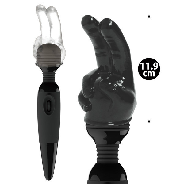 ひとりタイムでも指テク満喫!二本指がエロティックな指マン型電マアタッチメント。●直径4.5〜5.2cmヘッドの電マに装着可能●大人の夜をアゲるブラックカラー●プニッと弾力のエラストマー素材●ピースサインのような二本指形状●角度をつけた指で手マン風プレイ●同型のクリアver(b24916)も。もうパートナーの指ワザじゃ満足できなくなっちゃうかも?電マによるパワフル振動をそのままナカで体感できる専用アタッチメント。ひとりの時間でも前戯さながらの濃密テクニックを堪能できます。