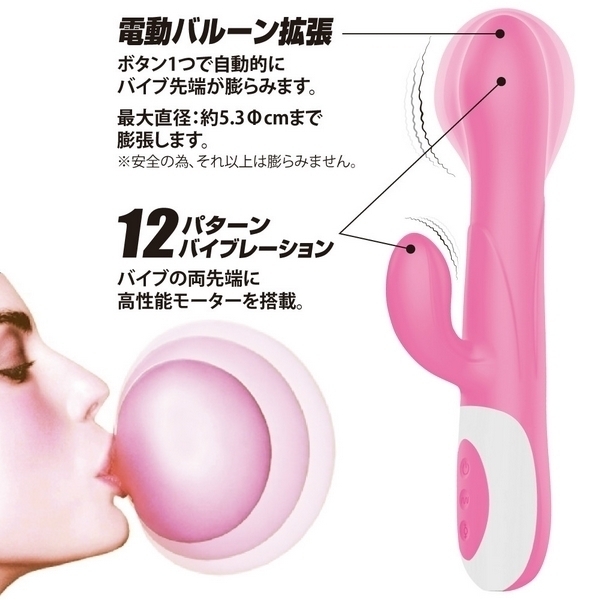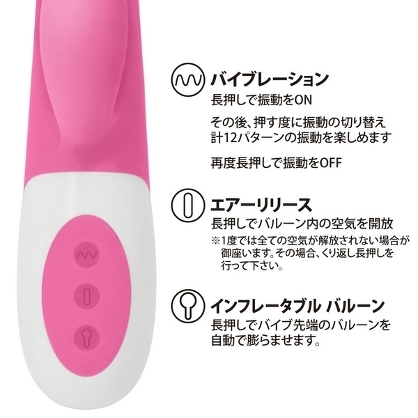 ワンタッチでグングン膨らむエアーバルーン仕様♪拡張にも適した「プリティラブ インフレータブルバイブレーター」。●自動で膨らむ先端バルーンモデル●全長24.5cm、通常時の最大径3.6cm●バルーン機能使用時の最大径5.3cm●エアリリース機能で内部空気を解放●ヘッド&クリバイブに12種振動搭載●手触りの良い高品質シリコンボディ●丸洗い可能な生活防水仕様で衛生的●タフなUSB充電式(専用コード付属)。拡張で感じる新たな快感♪バイブには珍しい電動バルーン機能を搭載した「プリティラブ」シリーズのインフレータブル式バイブレーター。ボタンひとつで先端が風船のようにプクーッと最大5.3cmまで膨張!さらに、12パターンのバイブレーション機能で多彩な振動刺激も楽しめます。ヴァギナだけでなくアナル拡張にも最適!空気を解放できるエアリリース機能も搭載されているので安心です。