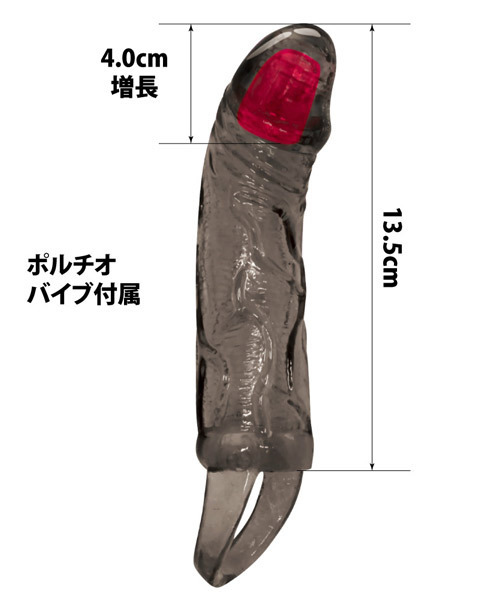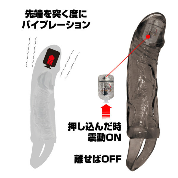 突く度に響く快感バイブレーション!亀頭ローター付きの電動ペニスサック。●フルカバーの極厚サック●高伸縮・高耐久のTPE素材●先端亀頭部にローター搭載●押し込むとON・離すとOFF●先端部の厚みで約4cm増長●固定用の玉掛けリング付き●持久力と射精感もサポート●ローターは着脱&電池交換可。ピストンの度に亀頭+ポルチオに響くローターの激振動!装着するだけで約4cmもサイズアップできる攻撃型の電動ペニスサック。振動快感やサイズアップに加えて、締め付けによるスタミナアップもしっかりサポートしてくれます。