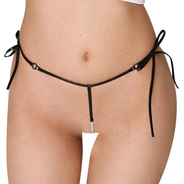 極細ストリングがセクシー!パールをピンポイントにあしらったGストリングショーツ。●漆黒エナメル製の妖艶デザイン●ウエスト両サイドを結ぶ紐パン●紐同士をOリングで連結して固定●クロッチ部分はミニパール仕上げ●バックはGストリング。繊細なエナメルストリングでドキドキ満点にデザインされた女性用セクシーショーツ。前も後ろも完璧な「T」字でシンプルなのに強烈インパクト!クロッチのツヤツヤ純白パールが一層際立ちます。
