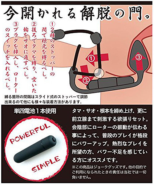 男の快感を助太刀!ループタイデザインのペニスリングと電動アナルプラグを一体化させた「SUKEDACHINAWA(スケダチナワ)僧」。●伸縮性のあるシリコンタイ●玉袋・竿・根元を締め付け●スライド式で簡単に調整可●最大径2.8φcmのプラグ付き●内蔵ローターが会陰部刺激●簡単操作のワンタッチ電源●ローターは着脱可能。今開かれる解脱の門!3点を同時攻めしながら勃起力まで助太刀してくれる男性用補助グッズ。2本のストッパーの間で根元を縛り、後ろ側で玉袋を縛って開いた輪をサオに通したら、アナルプラグを挿入してローターのスイッチをON!締め付けによる持久力UPだけでなく、男性の性感帯である「蟻の門渡り」を刺激することで射精感もUP!快感もパワー不足もアシストしてくれるマルチなアイテムです。