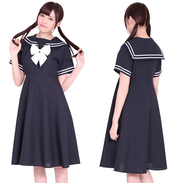 長めのワンピースでお嬢様風に♪紺×白カラーのセーラー服コスプレ。セーラー服では珍しいワンピースタイプ!ハイウエストデザインなのですっきりとした清楚な印象に♪可愛らしい白リボンをアクセントにしたスクール制服コスチュームです。※セット内容以外は付属しておりません。