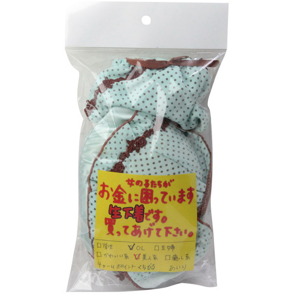 一般女性の生下着をお届け!エッチな妄想が膨らむ生ブラ&生パンティ。●限定買取りのブラジャー&パンティー●オナニーが捗るフェチグッズ●ランダムデザイン。お金に困っている素人さんが持ち込んだアイテムを、そのままパックしたかのようなリアル感!どんなデザインの上下セットが届くかは到着してからのお楽しみ!ぜひ買い取ってあげて下さいね。※USED加工を施した新品未使用品です※アソート商品の為、色・柄・形のご指定はできません