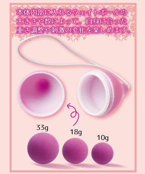 膣圧向上で美ボディへ♪膣圧を鍛える『ケーゲルトレーニング』に効果抜群な膣トレグッズ「セクシャルエクササイズ」。重さの異なるウェイトボールが3種類付属しているので負荷調節が可能!エクササイズエッグ内部へ入れるウェイトボールの大きさや数によって、自身に合った重さ調節や刺激の変化を楽しめます。膣トレだけでなく、アナルプラグとしても使えるマルチなラブグッズです。素材:ABS樹脂(硬質)。