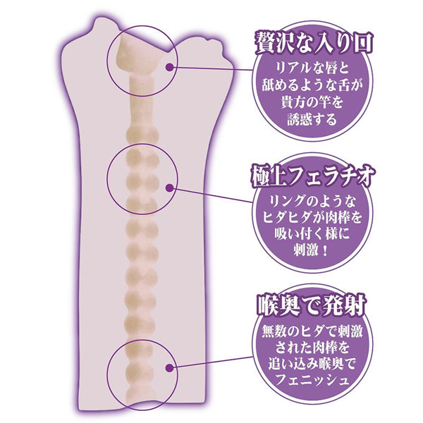 イイオンナ、ゆかりの舌使いと口内の粘膜で絶頂!ヒダヒダの喉で感じる至極のフェラオナホール「イイオンナ、ヤリ放題 宮沢ゆかり」。入り口からリアルな唇と舐めるような舌がアナタの竿を誘惑!続いてリングのようなヒダヒダが肉棒に吸い付くように刺激します。さらに奥へと肉棒を吸い込み、最後は喉奥でフィニッシュ。全身でイキまくるゆかりちゃんの清純ボディを堪能できる貫通型フェラチオオナホールです。
