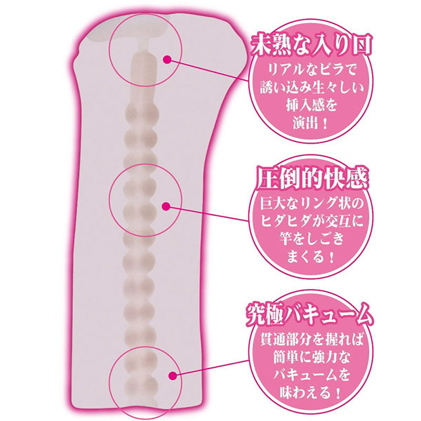 イイオンナ、みおのモチ肌と極上快感で昇天必至!とろける極上刺激のオナホール「イイオンナ、ヤリ放題 篠崎みお」。みおちゃんの優雅で無垢なボディをイメージした入り口はリアルなビラで生々しい挿入感を演出!その後、巨大なリング状のヒダヒダが交互に竿を刺激して最高の快楽へと導きます。さらに貫通部分を塞げば簡単にバキューム刺激も体感できる一挙両得なオナホールです。