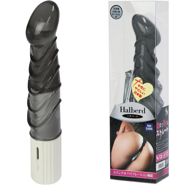 ぷっくりヘッドが奥まで届いてポルチオ刺激!原点回帰のストレートバイブ「ハルバード ブラック」。連続刺激を与えるヒダのような凸凹ボディ!特徴的なヘッド形状でナカとGスポットをかき回すスイング機能と、膣に響きわたる快感振動の二重責め!女性に優しい程よい弾力で挿入感も抜群です。強弱の変更はシンプルな無段階スライドスイッチで微調整も可能。単三電池×2本付属。
