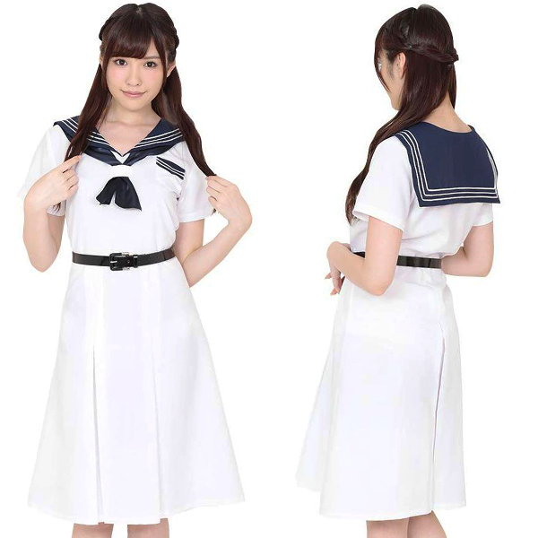 純白カラーが眩しい、清潔感と可愛らしさを見事に演出できる紺色のセーラー襟がついた制服コスプレです!白を基調としたワンピースは膝下ぐらいまであるので控えめで清楚なイメージを与えてくれます。架空の学校制服をイメージした2次元ならではの良さと、胸元のリボンと白い3本のライン使いが学校制服のキュートさも抜群に演出してくれています!パーティ―やパレードの衣装としてもオススメです。