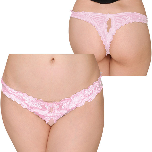 光沢感が特徴的なフェリカ生地を使用したショーツで、花モチーフのレースがエレガントな女性を印象づけます。優しいピンクで愛らしさを感じさせますが、なんとクロッチオープン仕様で着用したままでのプレイが可能というエロティックな要素も!後ろはTバックだから自慢のお尻を魅せつけることも出来ますね♪ナイトプレイで用いればパートナーと盛り上がれること間違いなしの一枚です!
