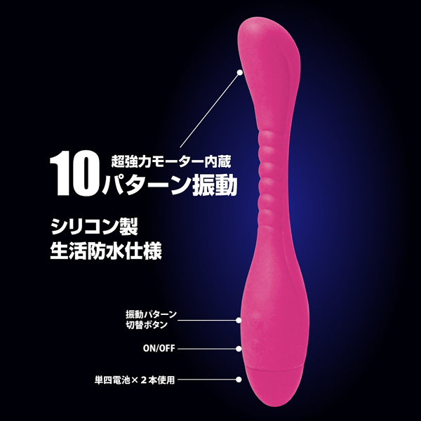 鞭のように「しなりが効いている」ストレートタイプのバイブです。女性器ならではの複雑な穴道に追従するように設計されたその形状は、バツグンの挿入感と快感をもたらしてくれます!やや膨らみが感じられる先端部分には、強力モーターがしっかりと内蔵されているので挿入することで振動による刺激を存分に味わえる逸品となっています。ギリギリ奥まで挿入できるタイプのストレートバイブをお探しの方には特にお勧め!10パターンによる豊富な振動刺激やコブラのように根本からフレキシブルに曲がる挿入シャフトも新鮮ですよ♪生活防水仕様なので、使用後のメンテナンスも簡単です。