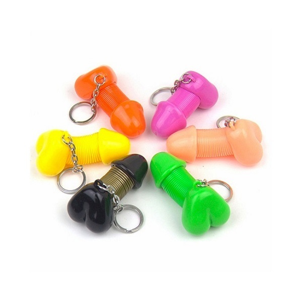 ポップなカラーが多数!全6色のプラスチック素材を採用したユニークな珍型キーホルダー♪ちょっぴりエッチな見た目で風俗店舗様のイベントグッズとしても最適なグッズで、外れにくいリング型のキーホルダーとなっております。タマの部分を持って亀頭を引っ張ると、スプリングになったサオの部分がぐぐーんと伸びる仕様!空いた時間についつい遊んでしまいそうなジョークグッズです♪