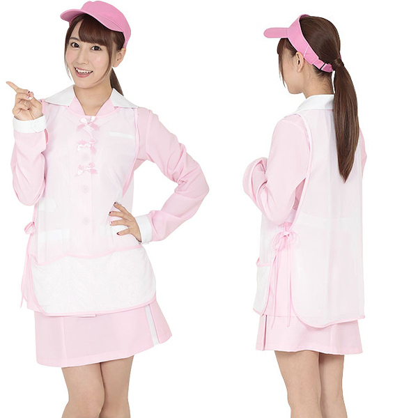 淡いピンクカラーとホワイトカラーでまとめた愛嬌満点なキャディコスチューム。衣装を覆うビブス型ゼッケンのフロント部分にはピンクのリボンを三つあしらい可愛くデザイン!日差しをカットするサンバイザーもピンクで統一し、女性らしいフェミニンな雰囲気に♪程よい丈感のスカートはセクシーすぎず、キャディさんらしい健康的で可愛らしいコスプレ衣装となっています。