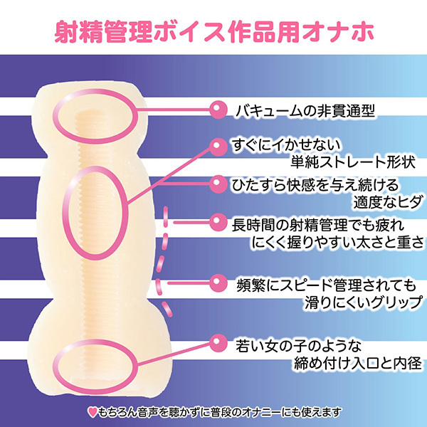 シコシコ音声でイクッ!同人サークルゼロナナニラボから発売のオナホ音声。ストーリー性のある射精管理ボイスにより、触覚だけでなく聴覚からも感じることができます!気になるオナホはバキュームタイプの非貫通型♪すぐにはイケない単純ストレート形状とひたすら快感を与え続ける適度なヒダ、頻繁なスピード管理でも滑りにくいグリップと、握りやすいホール外観の太さと重さも良いですね!まるで若い女の子のようなホール入口と締め付けも新鮮♪オナホ単体としても、奥までビッシリと配置された細かなヒダと裏筋によるヒダ名器がたまりません。もちろん音声を聴かずに普通のオナホとしてもお楽しみ頂けますよ!