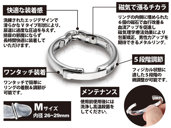 スタイリッシュな男性補助グッズで、オシャレに逞しい男根を手に入れるならコチラのペニス増強グッズ。内径2.6cm〜2.9cmの男性を対象に、6つの磁石で血流をUP!持久力や勃起力を高めるほか、亀頭の周りで包皮をまとめることで包茎のお悩みにもアプローチ♪洗練されたデザインは尿道を締め付けすぎることがないため排尿時に邪魔になる心配もなく、長時間の使用でも快適な装着感を実現しました。サイズは5段階調整が可能、メタルリングなので洗浄もラクラク!煮沸消毒による高温殺菌もしていただけます。