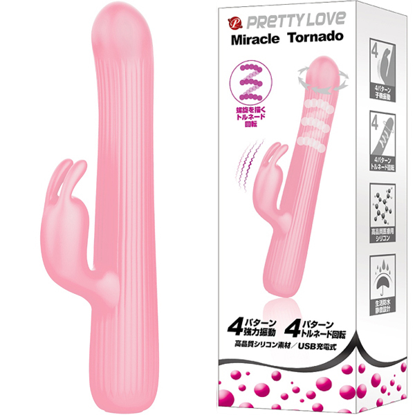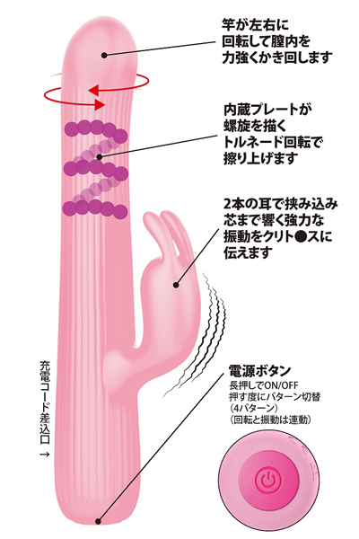 振動&トルネード回転。竿の回転と同時に内蔵プレートが螺旋を描いて膣内をかき回す高性能バイブレーター!グリグリとうねる刺激はかつて味わったことのない快感。螺旋回転がGスポットを擦り上げるように刺激!更にウサギ型の子機が強力振動でクリをピンポイントで刺激します!●4パターンのトルネード回転●4パターンの子機振動●高品質シリコン素材●生活防水●静音設計●専用USB充電コード付属、充電時間:90分、連続稼働時間:50分