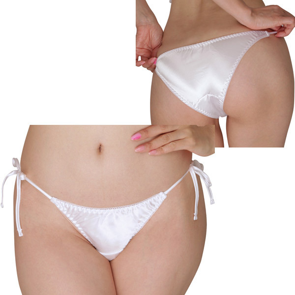 光沢感が美しいサテン生地の女性用フルバックショーツ。両サイドはセクシーな結びヒモ仕様で、結び目をパートナーに解かせる楽しみも!ホワイトカラー
