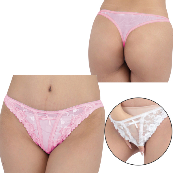 レースや花の刺繍をふんだんにあしらった可愛らしい日本製の極薄Tバック(ピンク)。クロッチ部分がオープン仕様となっているため、服を脱がない着衣プレイに最適です♪