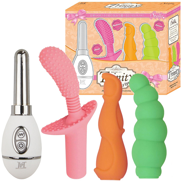 アタッチメントを付け替えて多彩な刺激が楽しめる取替え式のロータートリニティーの第2弾!ヴァギナやアナルそれぞれに適したヘッドを取り付けたり、その時の気分によって攻め方を変えたり用途は様々♪・Thrill:ヘッド部分が大きくイボイボになったタイプ。ゾクゾクするような戻れない悦楽という冒険に旅立ってください!・Radiance:全体が複雑な形状になったタイプ。もっと奥まで、深く輝く場所を弄ぶような快楽の園を味わってください!・Shimmer:先端に向かって細く