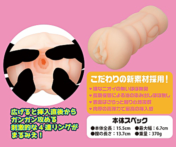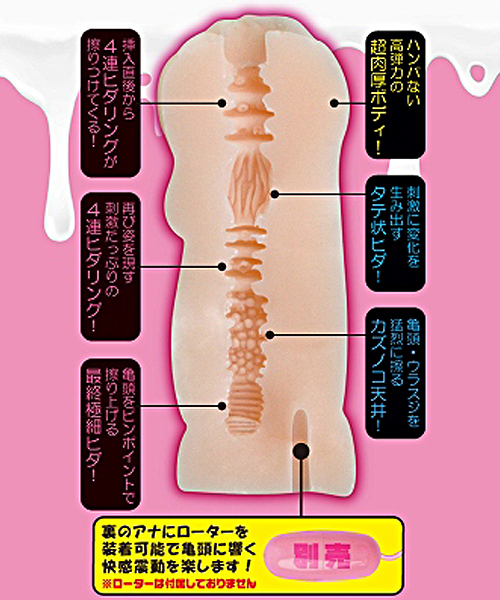 ヒダとイボが亀頭・裏筋を締め付け、擦り、撫でる、トレーニングで引き締まった腹筋女子のアソコ。ハンパない高弾力の超肉厚ボディで挿入直後から4連ヒダリングが擦り付けてくる!刺激に変化を生み出すタテ状ヒダに、亀頭・ウラスジを猛烈に擦るカズノコ天井と亀頭をピンポイントで擦り上げる最終極細ヒダ●ローターポケット付きでローターを装着して楽しめる●ローション付