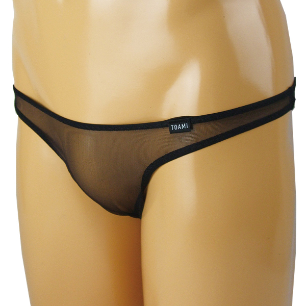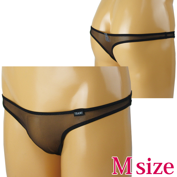 素肌が透けて見える極薄生地でありのままの貴男をアピールする男性用Tバック(日本製)。男の魅力を上げるブラックカラー!「TOAMI」と書かれた黒タグもまたお洒落度高め♪ローライズ×スケスケ生地でセクシーに魅せつけます。