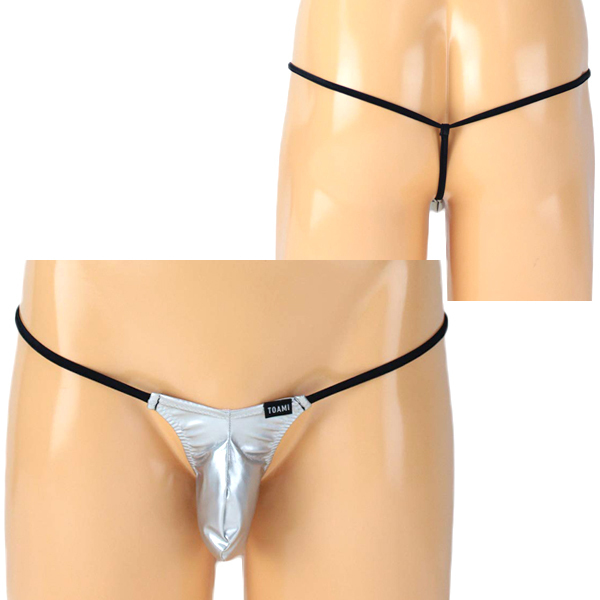 光沢感が美しいエナメル生地で男性のシンボルを魅力的にアピールするメンズ用Gストリング(シルバー)。フロント部分は立体縫製で男性器がすっぽりと収まり穿き心地抜群!露出度満点なセクシーなメンズショーツで大胆にキメる♪