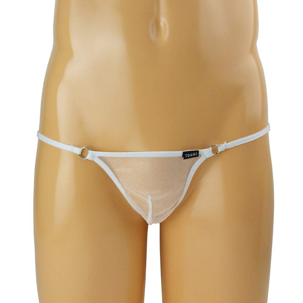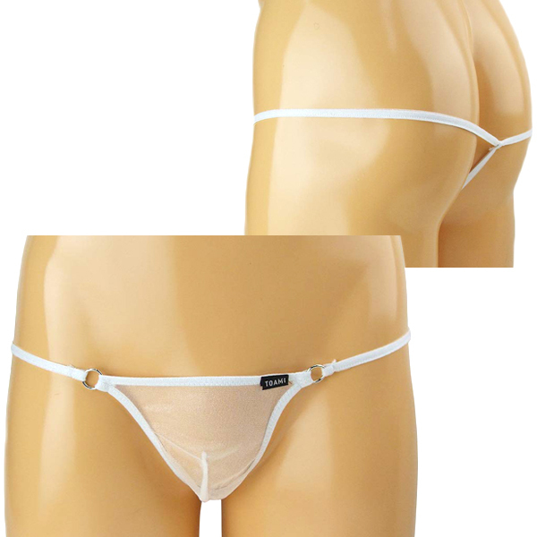 スケスケ感が大胆過激な日本製のメンズ用セクシーTバック(白)。肌が透けて見える通気性抜群な極薄生地と腰の細紐を丸型のゴールドリングでジョイント!夏などの暑く蒸れやすい時期にうってつけの一枚。