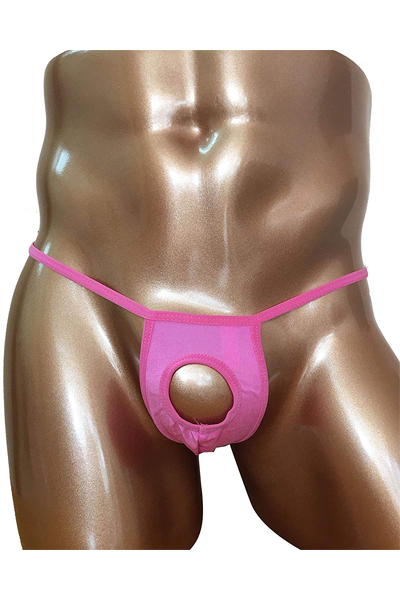 男のシンボルを大胆に露出する穴あき仕様のメンズ用Tバック(ピンク)。フロントの穴から竿出し可能!逞しい貴男を強調したい時は大胆過激に露出してセクシーにアピール♪優しく手洗い、または網ネットに入れて洗濯して下さい。
