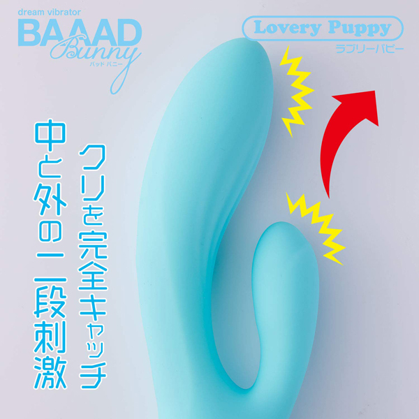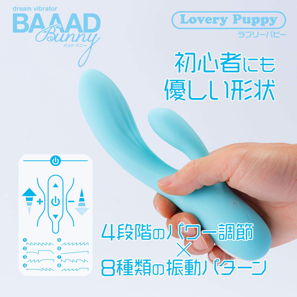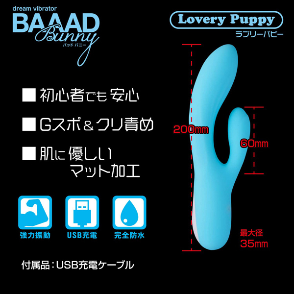 初心者さんにも最適な可愛い「バッドバニー」シリーズより、大きな面でクリを刺激するUSB充電式バイブ「ラブリーパピー」。肌触りの良いマットなボディが、4種類の強弱と8種類の振動パターンでGスポとクリを同時に刺激!可愛らしいボディが生み出すパワフル振動に貴女も虜になる♪お手入れ簡単、丸洗い可能な生活防水仕様!充電ケーブル付属