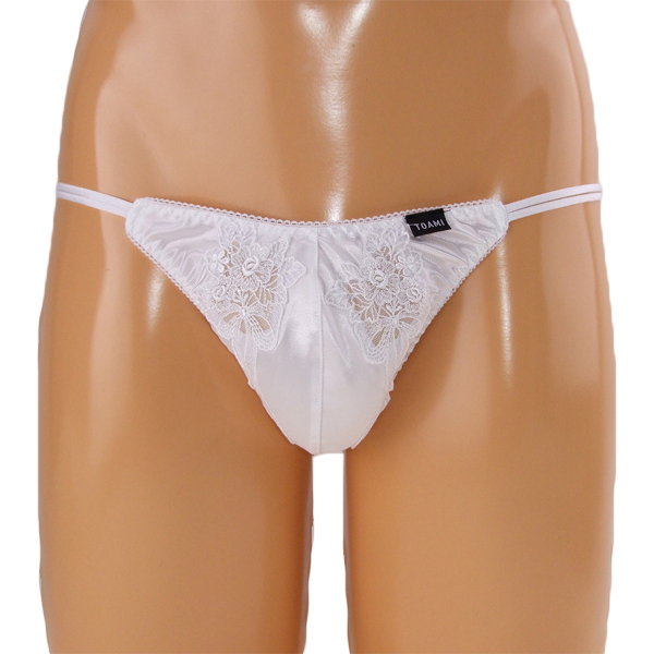 上品な光沢と華やかな花柄レースが下半身を美しく飾る♪伸縮性抜群のストレッチ生地を使用した日本製フルバック(白)。前後の花柄刺繍からうっすら見える素肌がセクシーな一枚!女装下着用にぜひ♪