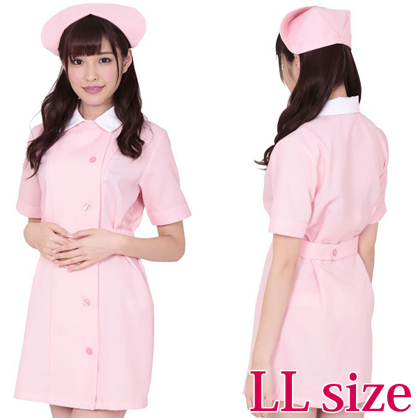 病気の時には天使のような笑顔で癒してくれそうな可愛いナースコスチューム(ピンク)。人気のナース服に大きめサイズが登場!淡いピンクで優しい印象を与えつつも、どこか大人の色気を感じさせるミニ丈仕様のナースコスプレです。