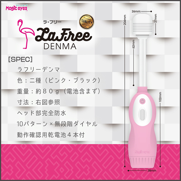 長く柔軟なフレキシブルネックがピンポイントに優しくフィットする電池式電マ「ラ・フリー(黒)」。6Vの強力振動×10種類の振動パターンを搭載!強弱は無段階調整式で電マを使用したことのない初心者さんにも最適♪また、重さは約80gと超軽量なので長時間の使用も疲れにくくなっています。単4電池を4本使用、完全防水※コントローラ部分は非防水