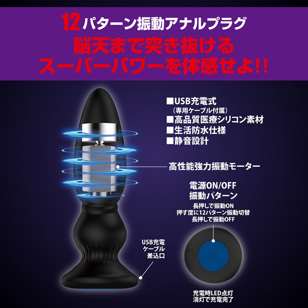 脳天貫くような快感刺激!高性能モーターを内蔵した凹凸形状の電動アナルプラグ。肛門に装着してスイッチON!電源のオンオフから12種類の豊富な振動パターンまで、1つのボタンを押すだけの簡単操作で楽しめる♪素材には肌に優しく滑らかな医療用シリコンを採用!安心安全のUSB充電式アナルプラグです。生活防水&静音設計