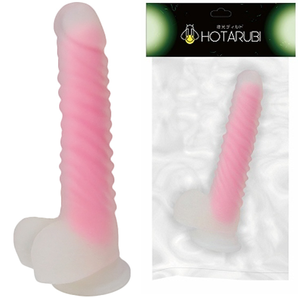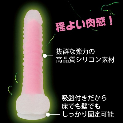 蛍の光のように薄暗闇でほのかに光る!もっちり質感の気持ちいい吸盤付きの夜光ディルド。肌触りの良い高弾力シリコンを使用し、中はしっかりめ、外は柔らかな二層構造で設計!ベッドの上はもちろん、吸盤があるので壁や床などにピッタリ吸着させてお使いいただけます。