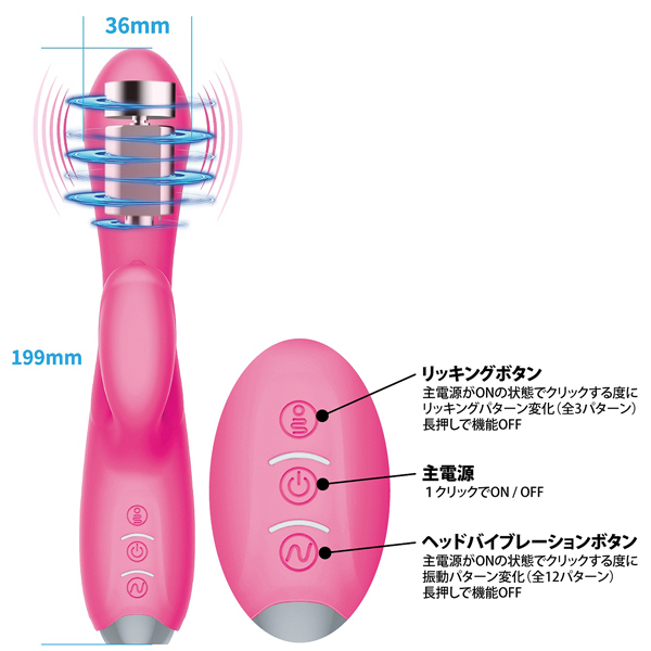 舌先がピンポイントに高速愛撫する生活防水製のUSB充電式バイブ。クリを激しく舐めながら幅広ヘッドでGスポを捉えて徹底刺激♪高性能モーターによる内まで響くような快感振動が全身を駆け巡る!素材には高品質シリコンを採用、密着形状で膣内にぴったりフィット!12パターンの振動と3パターンのリッキング(舐め)が味わえます。