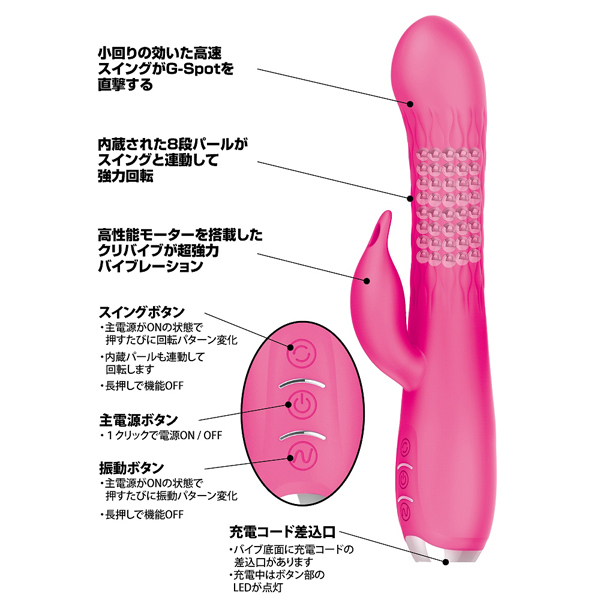 48個の回転パールが膣内を掻き乱す!3種のスイング&12種類の振動機能が付いたUSB充電式バイブ。8段×6連で設置されたパールがスイングと連動して強力回転!さらに追い打ちをかけるように高性能モーターを搭載した子機で敏感ポイントを徹底刺激する♪生活防水加工を施した高品質シリコンボディ仕様◎個別での動作操作も可能