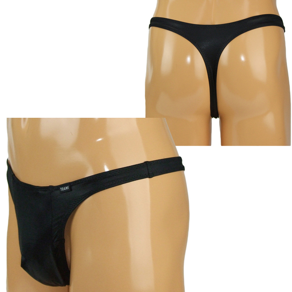 > メンズ 光沢ストレッチ生地玉袋付きTバック Mブラック